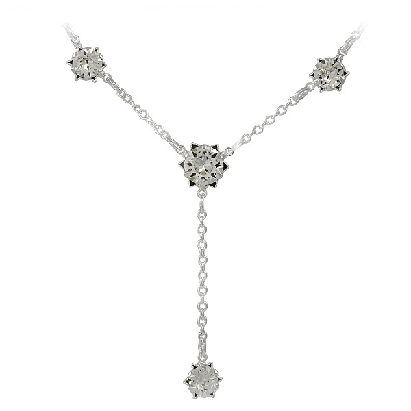 Náhrdelník je zdobený čirými krystaly Swarovski. Dominantní krystal ma velikost 11x11mm a je vsazen do precizně postříbřeného kovodílu. Ostatní krystaly jsou 8mm x 11mm . Celková délka přívěsku je 47 mm. Samotný řetízek bez posledního visacího krystalu je 42cm.