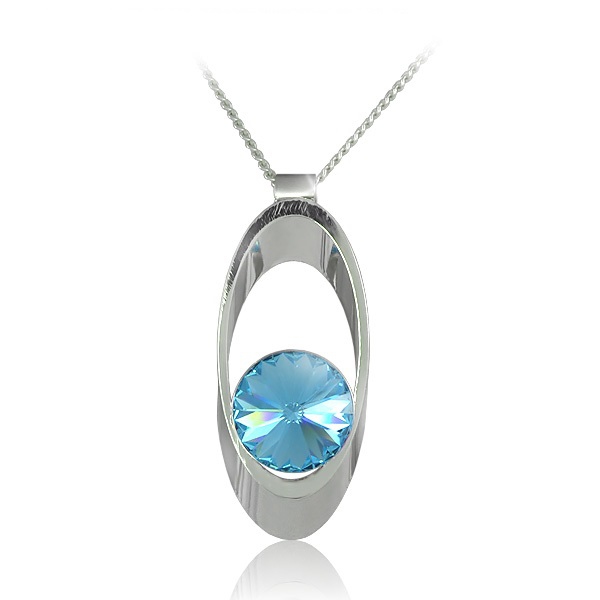 Luxusní rhodiovaný náhrdelník, který je zdoben světle modrými krystaly Rivoli o průměru 12 mm. Výrobcem krystalů je společnost Swarovski. Přívěsek náhrdelníku je 35 x 15 mm velký a je dodáván na 45 cm dlouhém kulatém řetízku.
