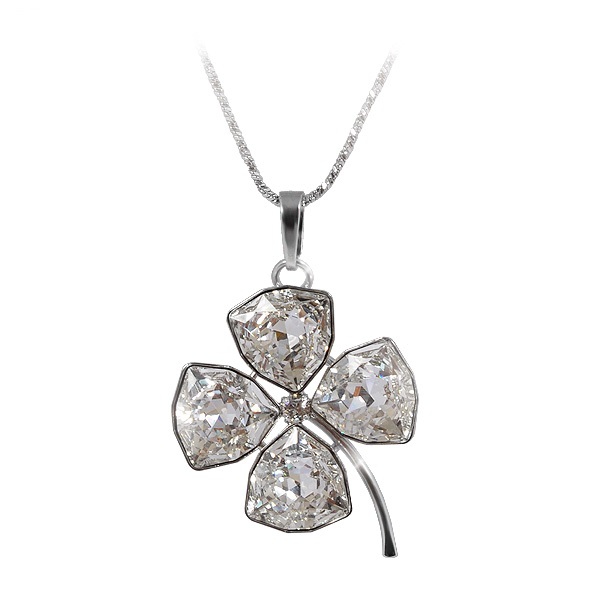 Luxusní, velmi výrazný náhrdelník je zdoben krystaly společnosti Swarovski. Rozměr masívního čtyřlístku je 3cmx3cm. Přívěsek je vyroben z ušlechtilého bižuterního kovu s mimořádně odolnou povrchovou úpravou - je potažen rhodiem. Přívěsek je dodáván na 50 cm dlouhém rhodiovaném kulatém řetízku. Lze nastavit o dalších 8cm.
