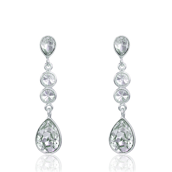 Náušnice jsou bohatě zdobeny krystaly Swarovski. Rozměr dominantního krystalu je 8 x 6 mm, ostatní krystaly jsou velikosti SS 24. Čiré krystaly jsou vsazeny do kvalitně postříbřeného kovodílu. Náušnice jsou dodávány na puzetách s nasouvacím uzávěrem z postříbřeného bižuterního kovu. Dřík je vyroben z titanu, má tedy antialergenní úpravu. Celková délka náušnic je 48 mm - exluzivní masivní náušnice.