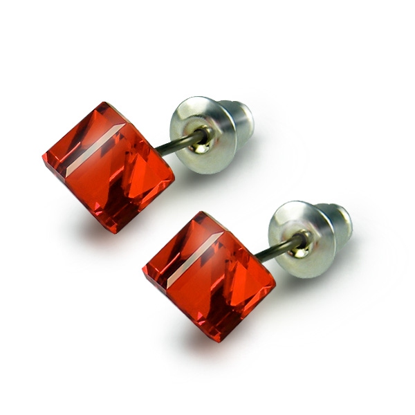 Náušnice jsou osazeny krystaly červené barvy, které vyrobila společnost Swarovski. Rozměr kostek je 6 x 6 mm. Náušnice jsou dodávány na puzetkách s nasouvacím uzávěrem z postříbřeného bižuterního kovu. Dřík je vyroben z nejtvrdšího kovu na světě - titanu. Nepodléhá oxidaci a nedráždí pokožku - je antialergenní, což zaručuje bezproblémové denní nošení těchto náušnic.