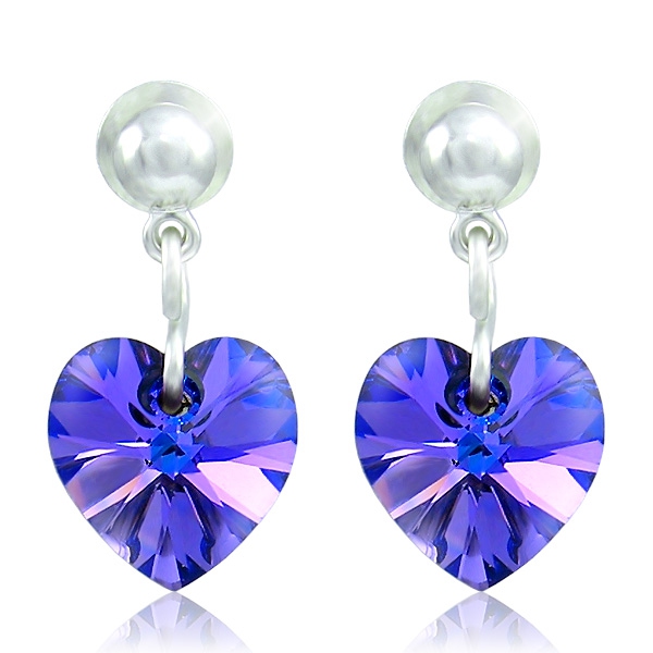 Náušnice jsou osazeny modro - fialovými krystaly Swarovski. Velikost srdcí je 10 mm. Náušnice jsou dodávány na puzetách s nasouvacím uzávěrem z postříbřeného bižuterního kovu. Dřík je vyroben z nejtvrdšího kovu na světě - titanu. Nepodléhá oxidaci a nedráždí pokožku - je antialergenní, což zaručuje bezproblémové denní nošení těchto náušnic.