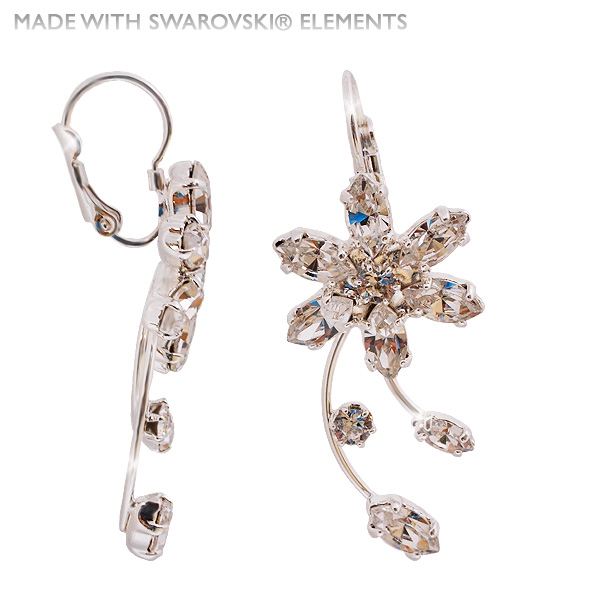 Postříbřené náušnice s motivem květiny. Velikost květiny je 1,7 x 1,7 cm. Celková délka náušnice je 4,5cm. Ozdoba náušnice je tvořena 10 krystaly Swarovski, které jsou vsazeny do kvalitně postříbřeného kovodílu. Náušnice jsou dodávány na postříbřených klapkách.