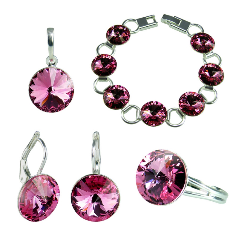Exlusivni set dekorovaný krystaly Rivoli společnosti Swarovski. Krystaly mají růžovou barvu a jejich průměr je 12 mm. Při výrobě tohoto setu byly užity kvalitní tuzemské kovodíly z bižuterního kovu, které byly galvanicky ošetřeny vrstvou stříbra. Set obsahuje náušnice, náhrdelník, prsten a náramek. Tento set expedujeme ve dvou dárkových kazetách.