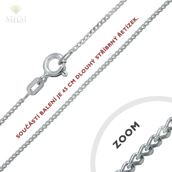 Přívěsek náhrdelníku je vyroben z ušlechtilého bižuterního kovu, který je potažen vrstvou stříbra. Celková velikost přívěsku je 32 x 12 mm. Přívěsek je dekorován 2 krystaly společnosti Swarovski o rozměrech 8 a 6 mm. Tento šperk je dodáván se stříbrným řetízkem ryzosti 925/1000 s celkovou délkou 45 cm.