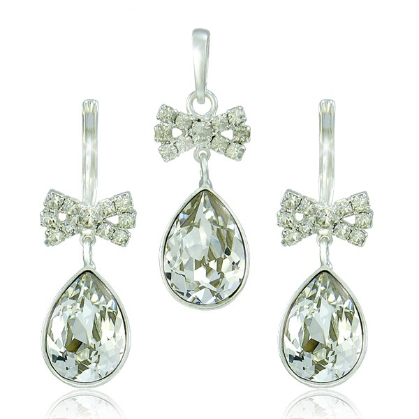 Štrasové náušnice jsou zdobeny krystaly společnosti Swarovski o velikosti 14 x 10 mm. Krystaly je vsazeny do postříbřeného kovodílu z bižuterního kovu. Náušnice mají decentní štrasové zdobení ve tvaru mašličky. Náušnice jsou dodávány na postříbřených klapkách.