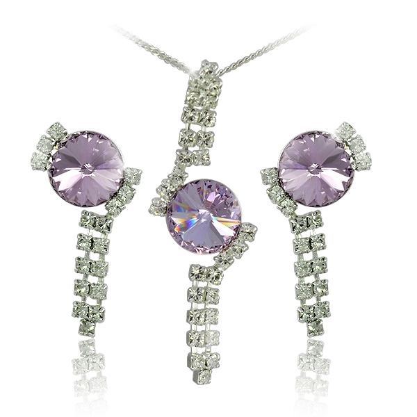 Luxusní štrasová souprava dekorovaná krystaly Rivoli fialové barvy společnosti Swarovski. Masivní štrasové zdobení podtrhuje jedinečný design této soupravy.